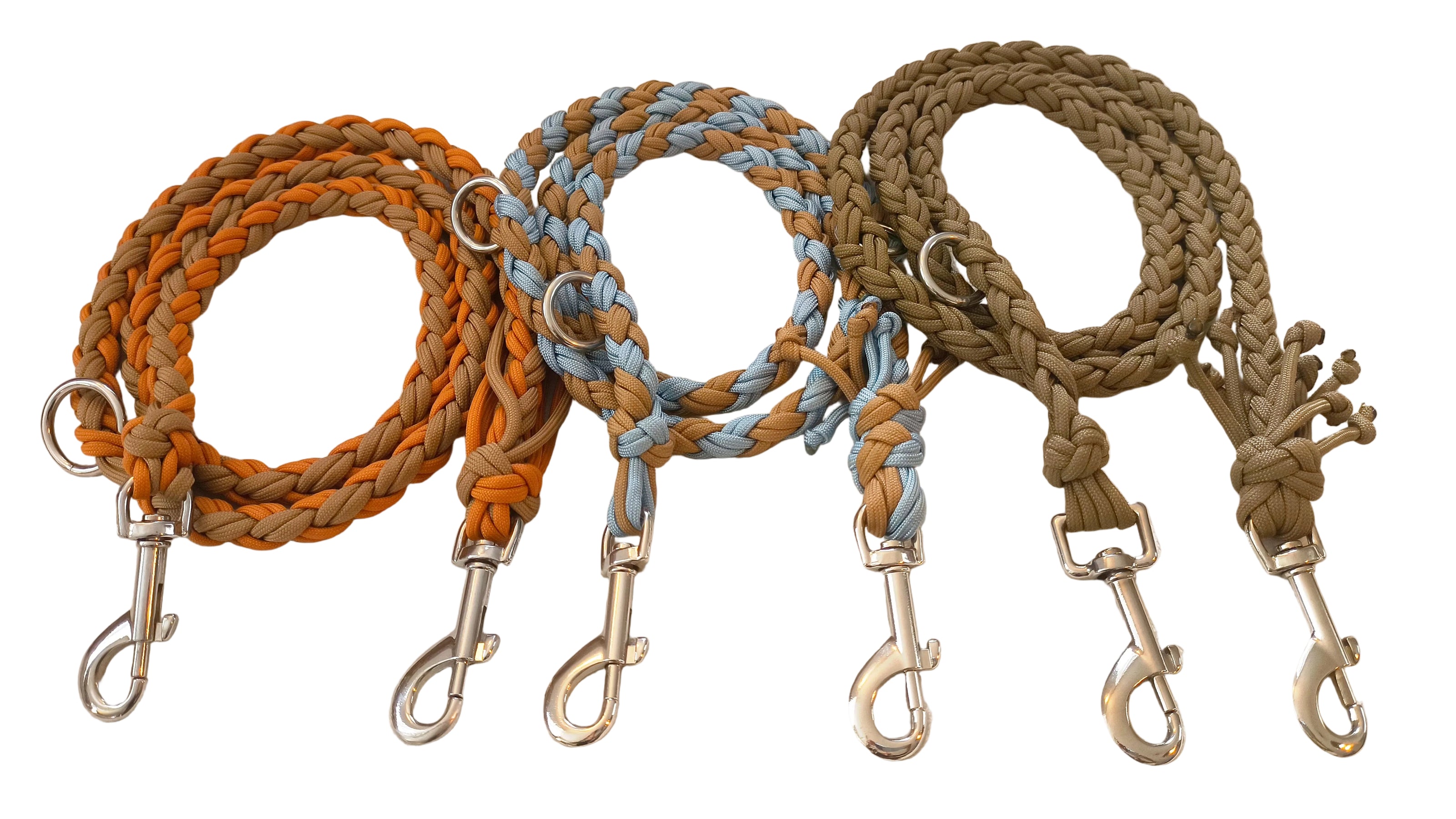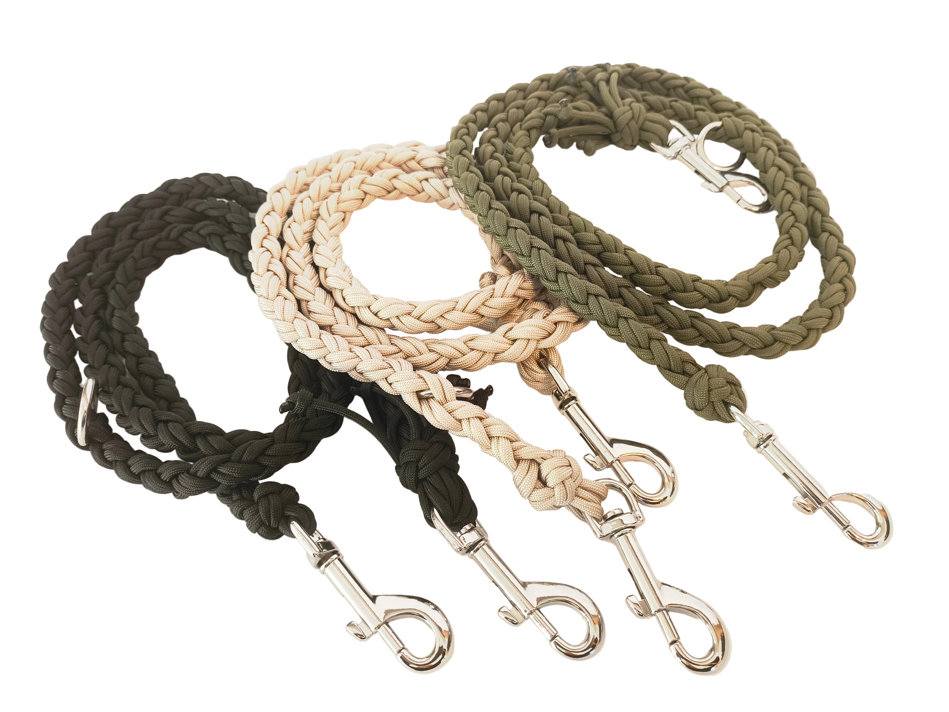 Die Längen der Leinen werden von Karabiner zu Karabiner gemessen. Es gibt sie in 140cm und 220 cm Länge