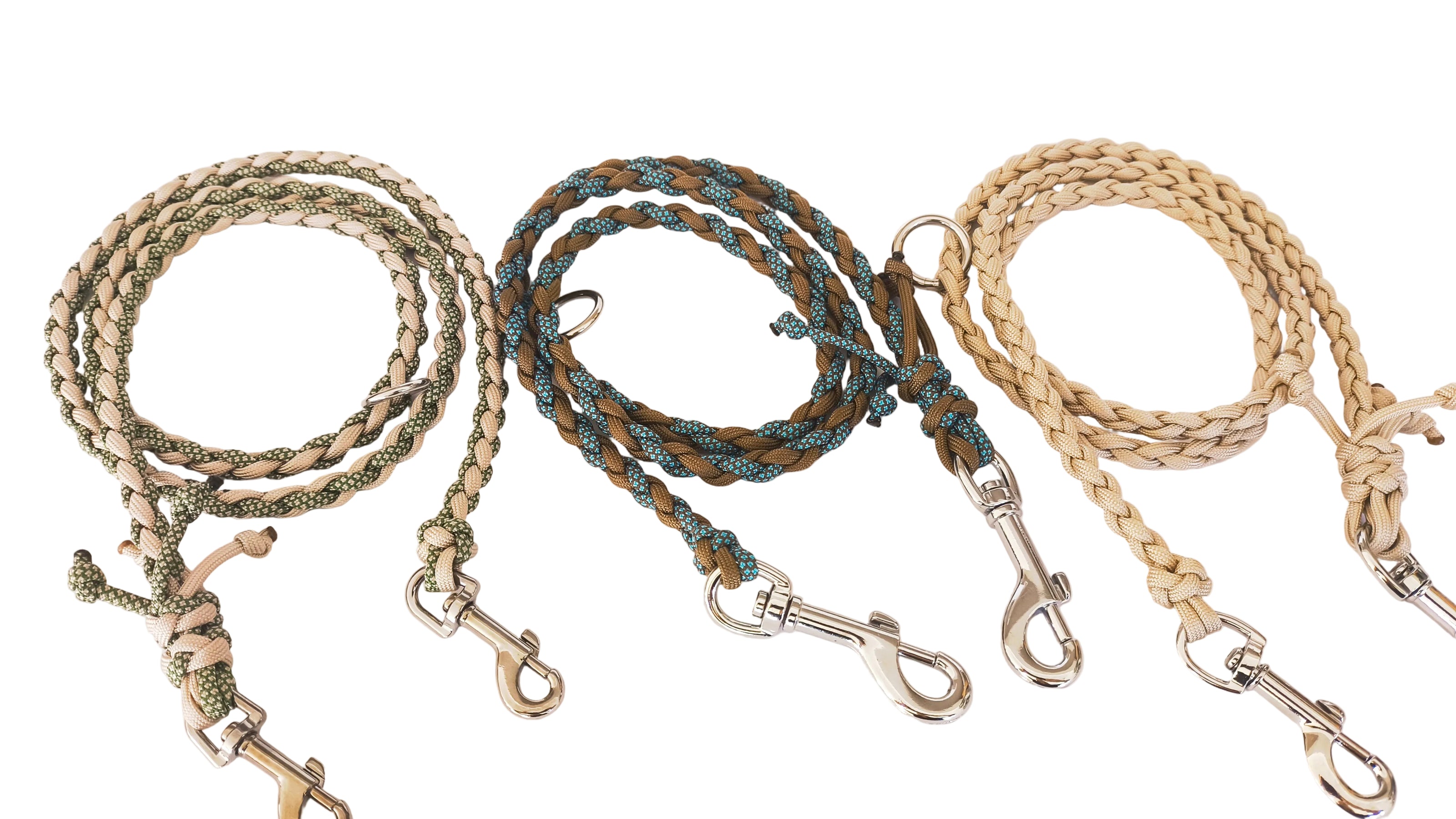 Die Leinen werden von Karabiner zu Karabiner gemessen. Es gibt sie in 140 cm und 200 cm Länge. Sie sind 2-fach rund geflochten und haben eine Dicke von 10 mm.